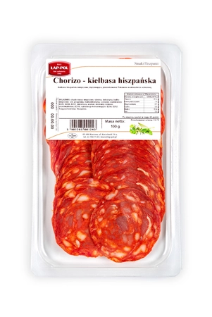 Chorizo to jedna z najbardziej rozpoznawalnych hiszpańskich wędlin, ceniona za swój ognisty kolor, aromat i wyrazisty smak. Nasze chorizo w plastrach o średnicy około 6 cm nawiązuje do tych hiszpańskich tradycji, łącząc chude mięso z kawałkami tłuszczu i dużą ilością papryki. To właśnie ta przyprawa nadaje mu charakterystyczny kolor, intensywny zapach i głęboki smak, który sprawia, że chorizo nie sposób pomylić z żadną inną kiełbasą.