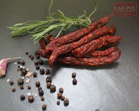 Kabanos z pepperoni to jest dokładnie to, o czym myślisz, myśląc o pikantnym kabanosie. Przyjemnie pomarszczona skórka, wyczuwalna papryka pepperonii, czarny pieprz i grubo mielone naturalne przyprawy. Kabanos prawdziwie charakterny. Walecznie usposobiony, bo papryki tu od groma. Chlubnie, nasyci żołądki dziczyzną i zagrzeje ducha do boju. W sam raz na deskę wędlin.